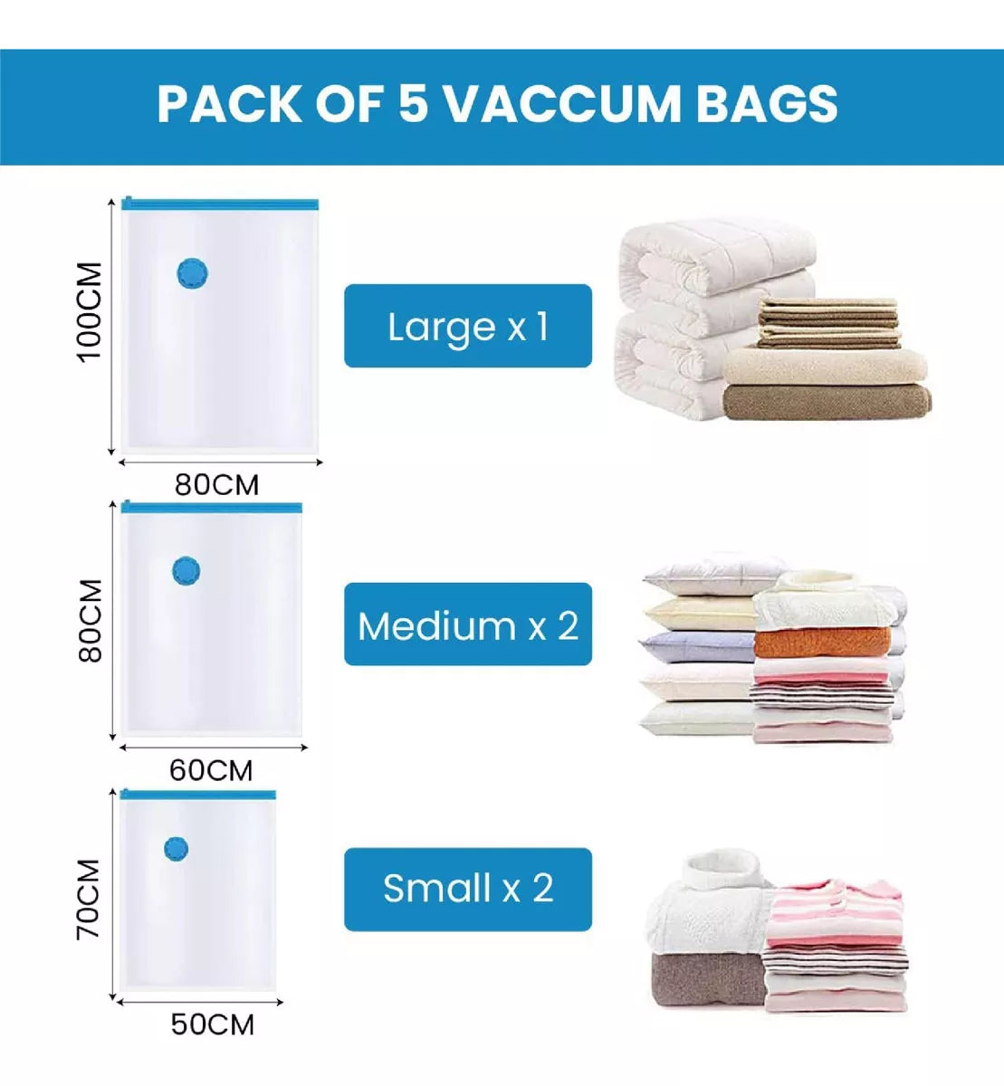 5 Bolsas de 3 Tamaños: Las bolsas extruidas tienen 3 tamaños (2* 50x70cm, 2* 60x80cm, 1* 80x100cm) para cumplir con tus diferentes necesidades. La bolsa de vacío es ideal para reducir el grosor de la ropa. Para optimizar el espacio de almacenamiento.